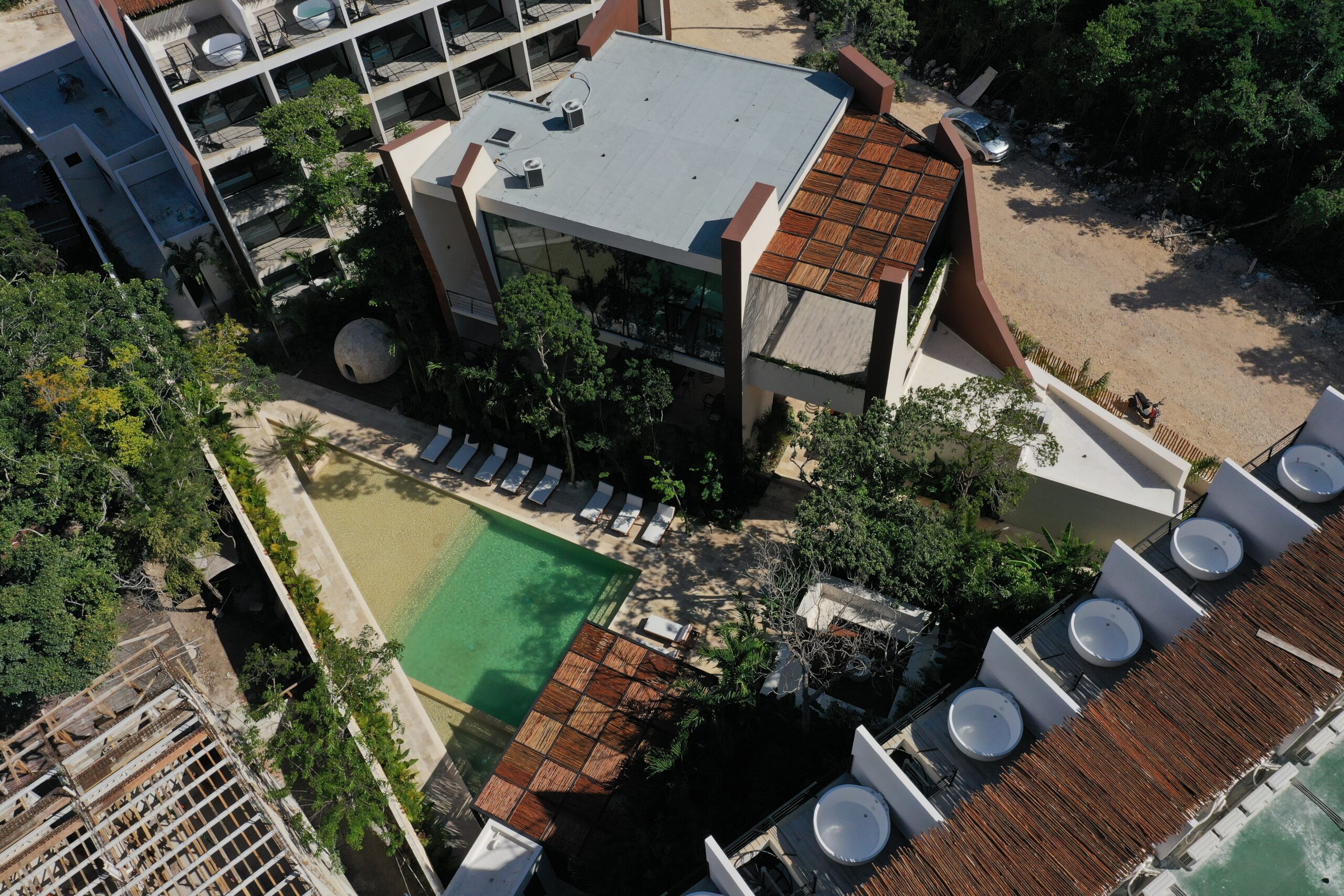 Su arquitectura contemporánea busca crear espacios abiertos, intercomunicadas entre sí por medio de andadores con una vista panorámica hacia la selva maya.